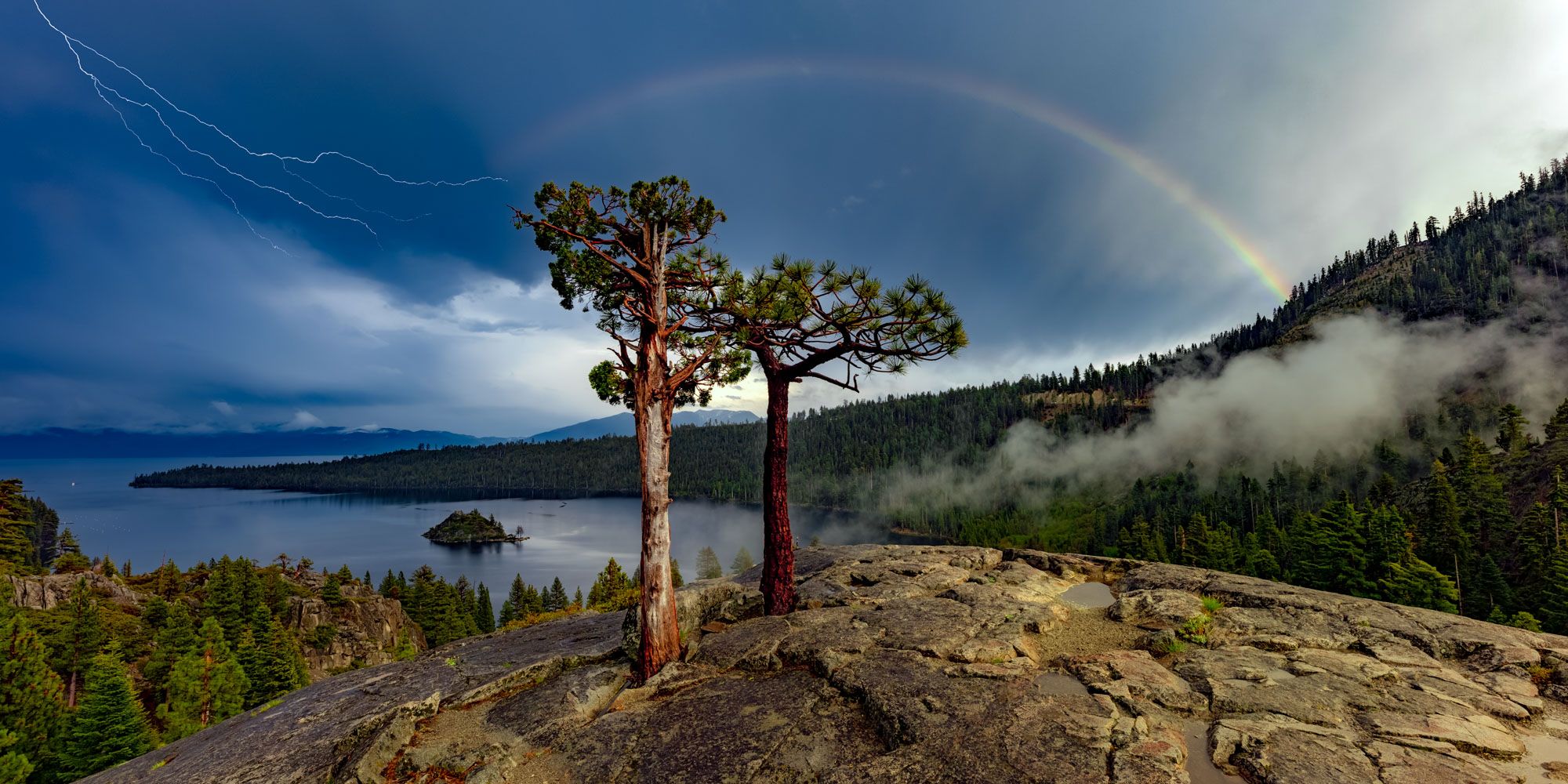 A bolt of lightning and an afternoon rainbow over Emerald Bay, Lake Tahoe,CA