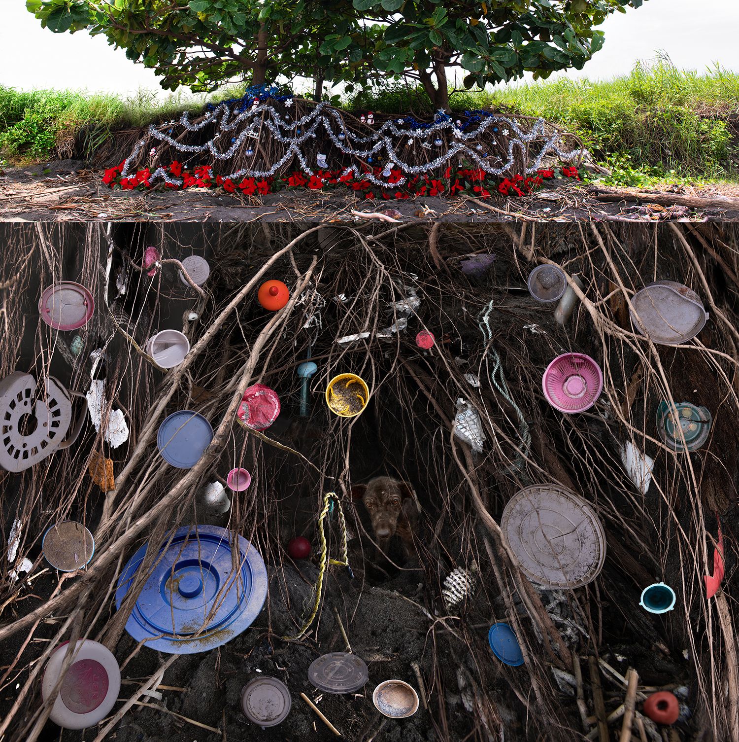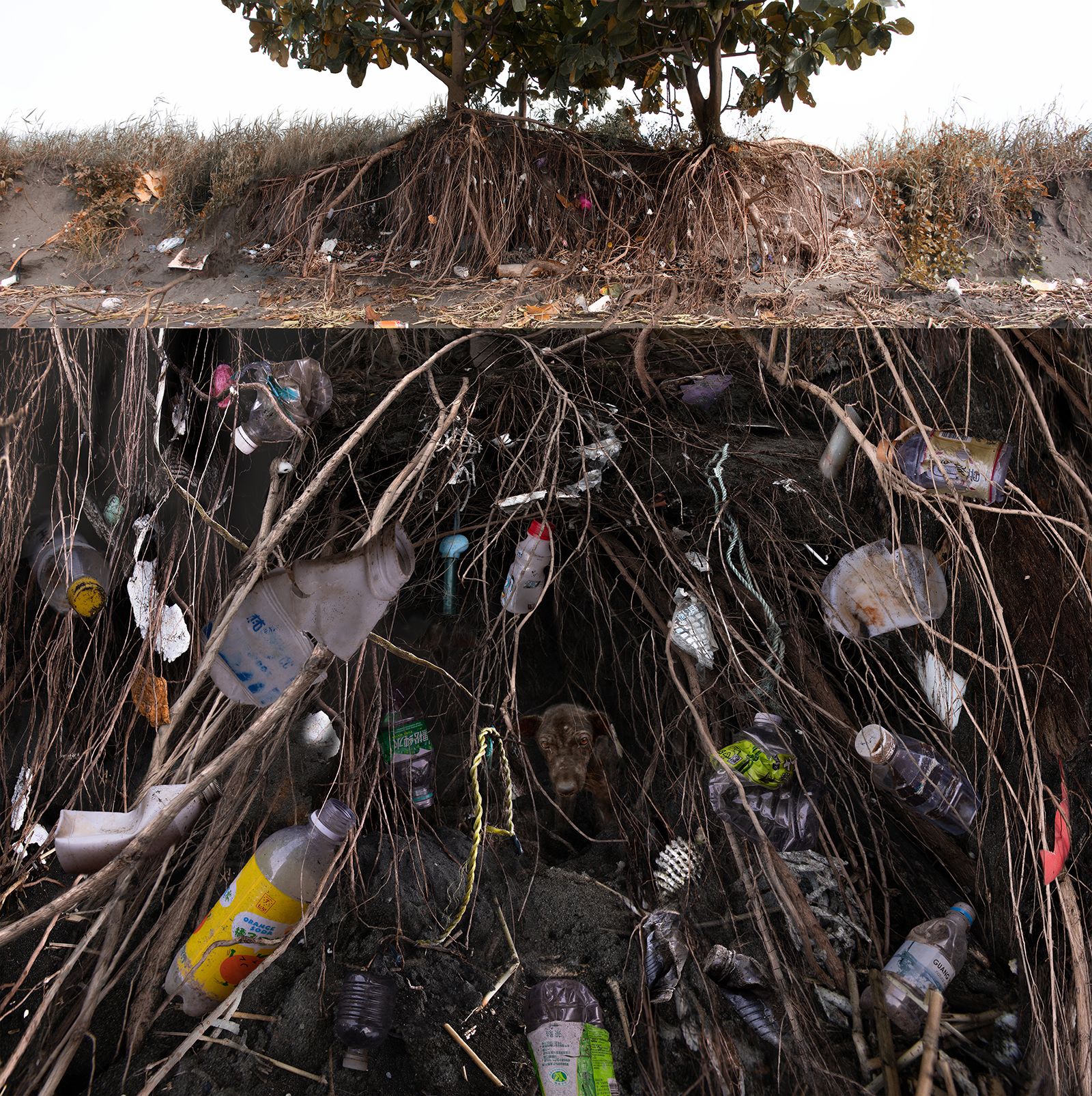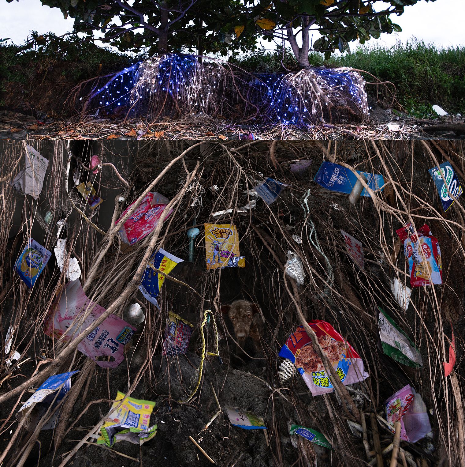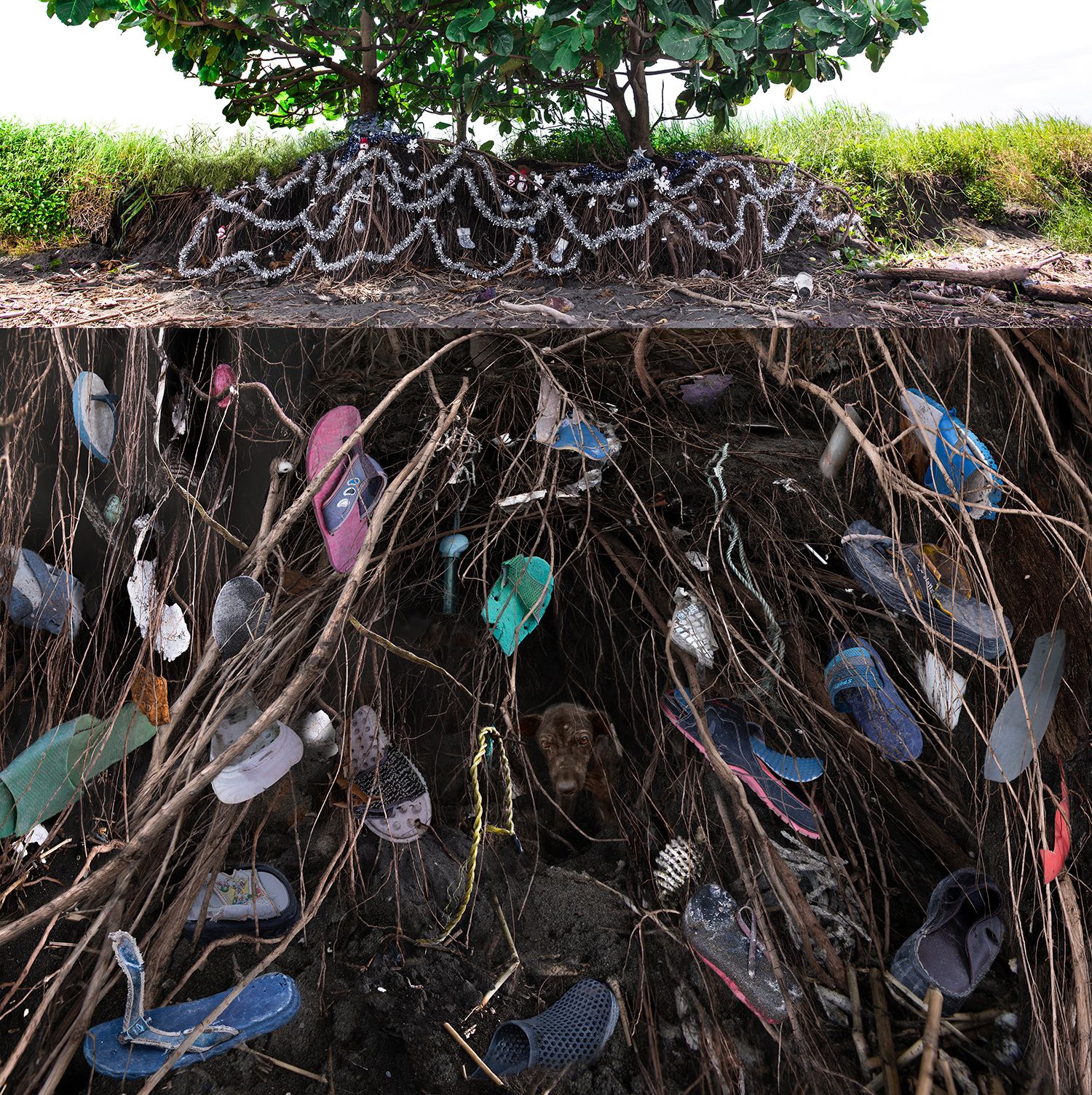 Dog murmurs there is a shiny Christmas tree at seaside; it’s beautiful but shows short of breath. Roots are desired for surviving and breathing. However sparkling surface links to waste objects left after happy hours. Being accumulated, washed off and piled up by Mother Nature and Time, the waste objects indicate a suffocating, embarrassing sight and vividly show a rotten interior beneath a fine exterior.