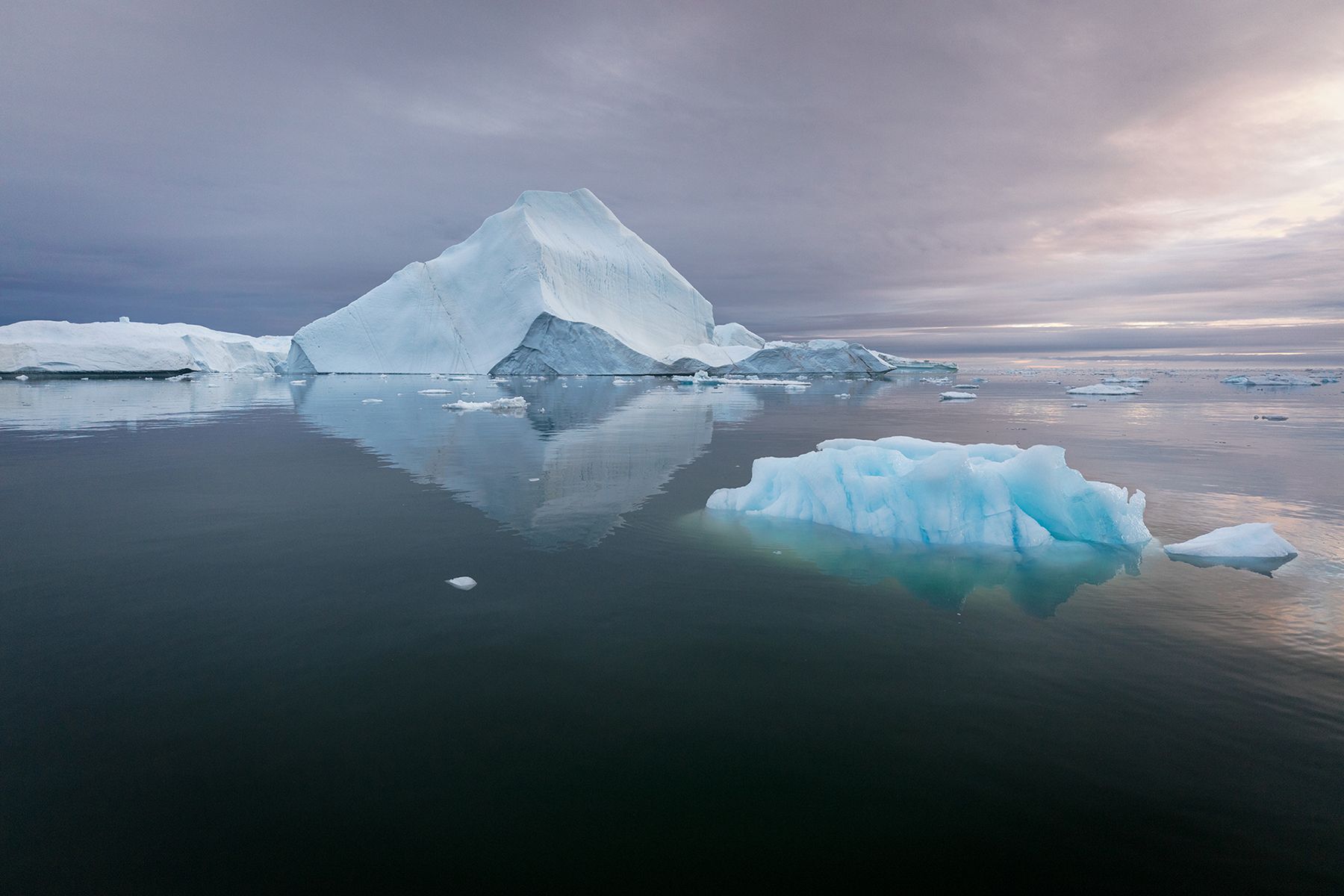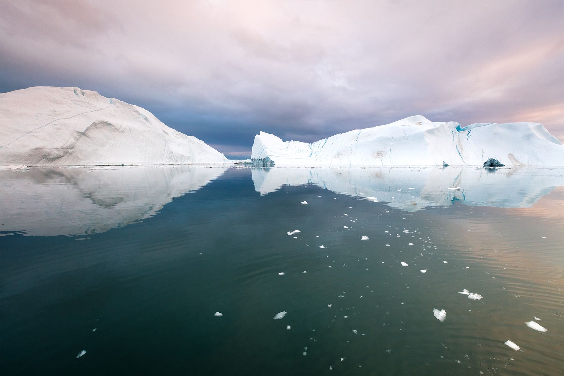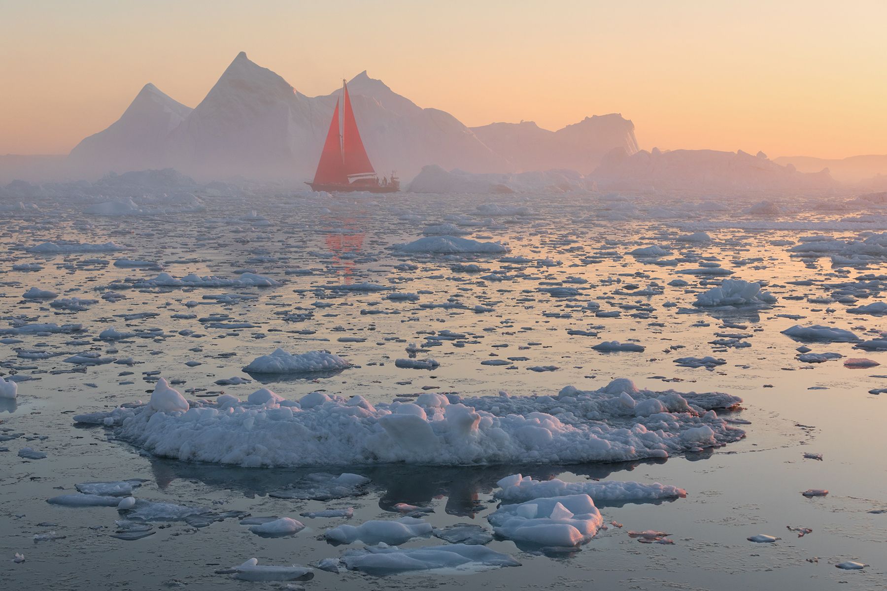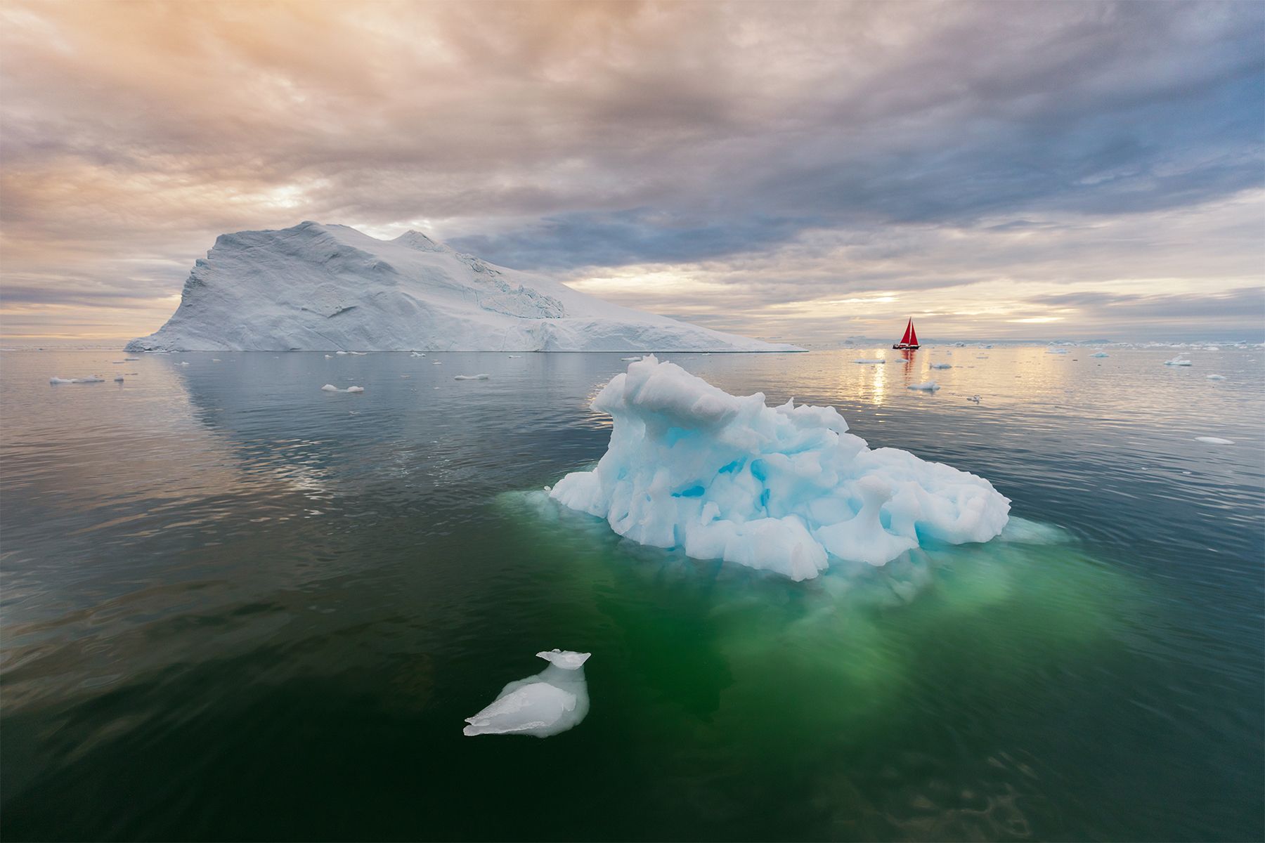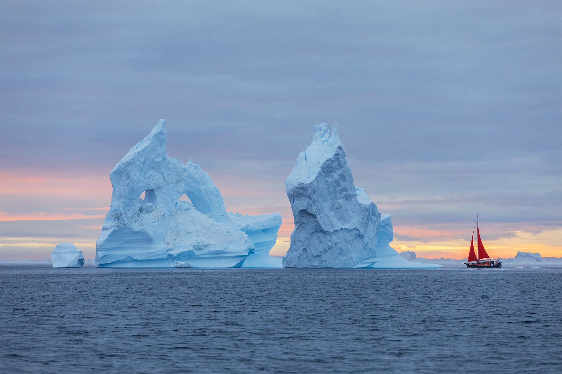 Midnight sailing among the colourful icebergs in Ilulissat Icefjord World Heritage Site in Greenland.
