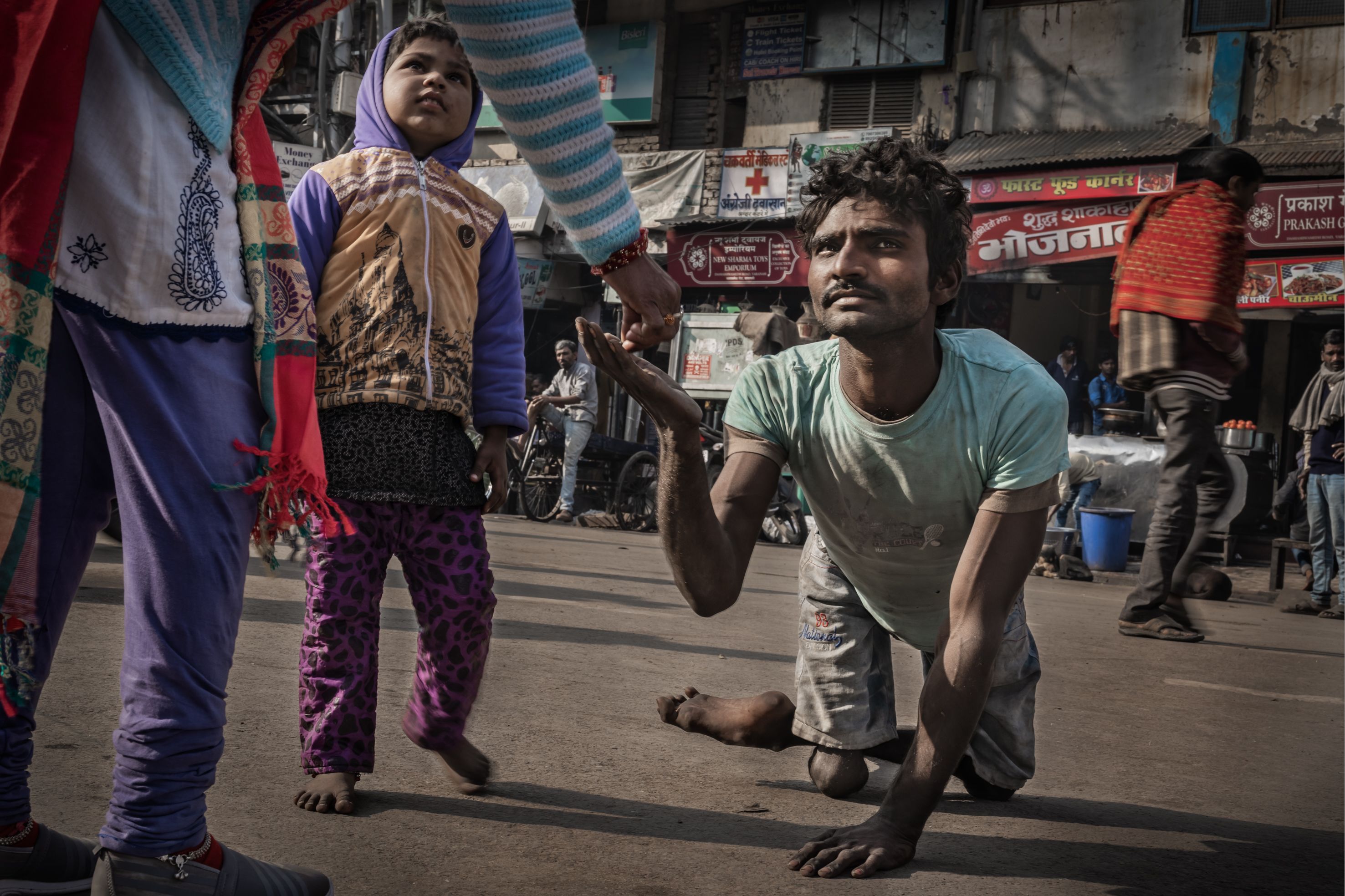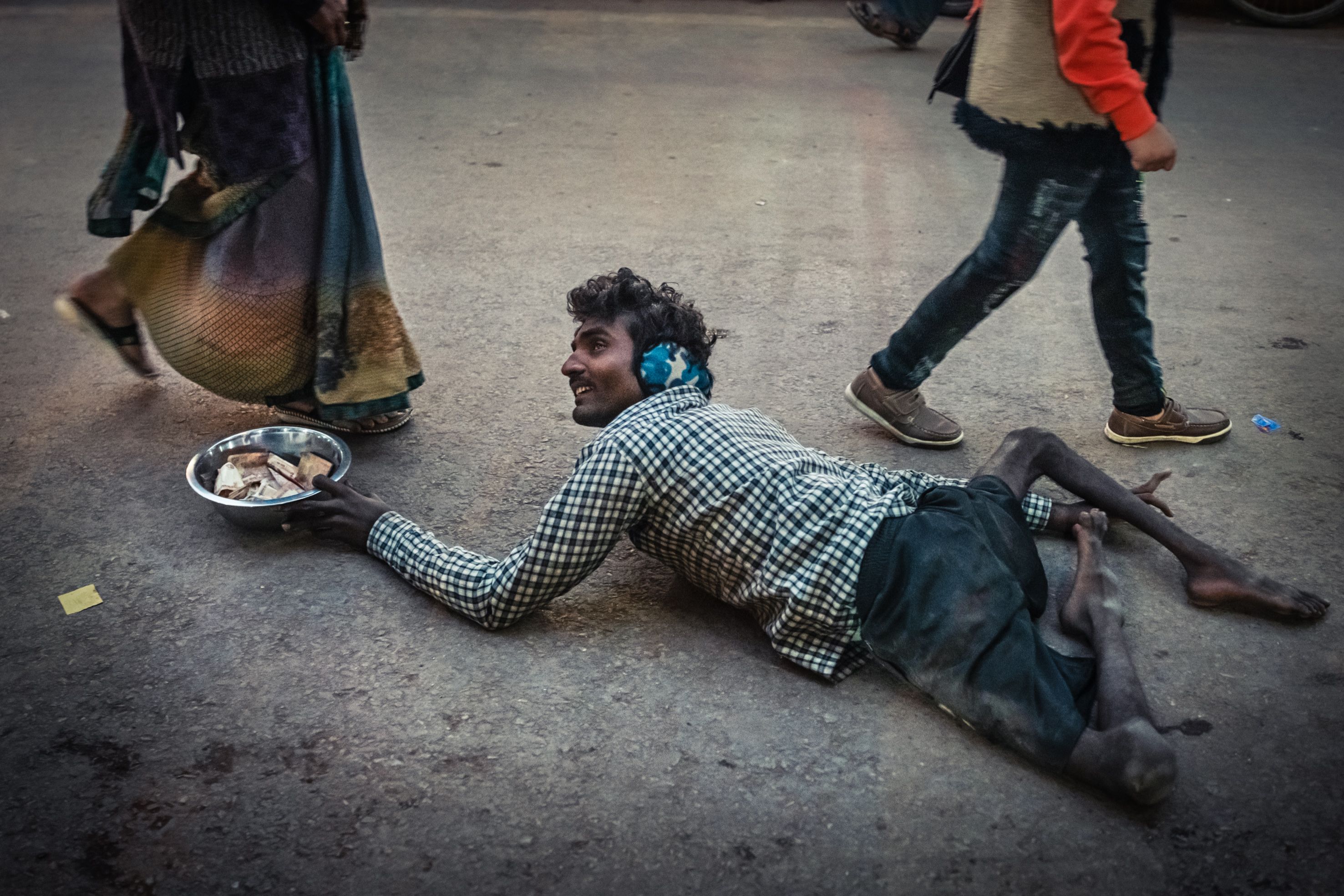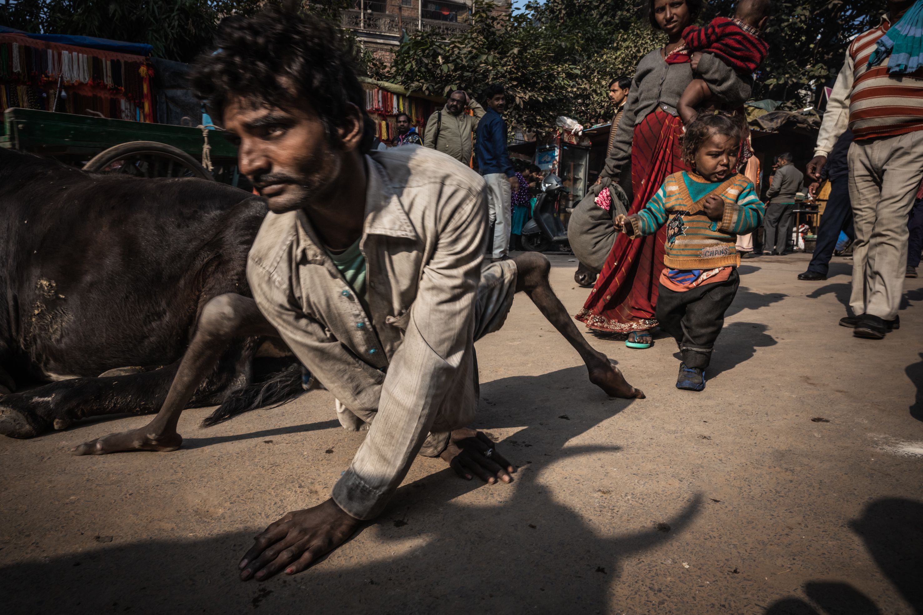 Polio sufferer, 30-year-old Rai Kumar lives with his wife Rekha and two children on the streets of Varanasi, India. Despite the painful handicap condition, he holds his spirit unexpectedly high. Rai keeps his family from the collected alms, and what is a great surprise, his beautiful smile attracts much more attention compared to other beggars which are widely seen in this holy city.