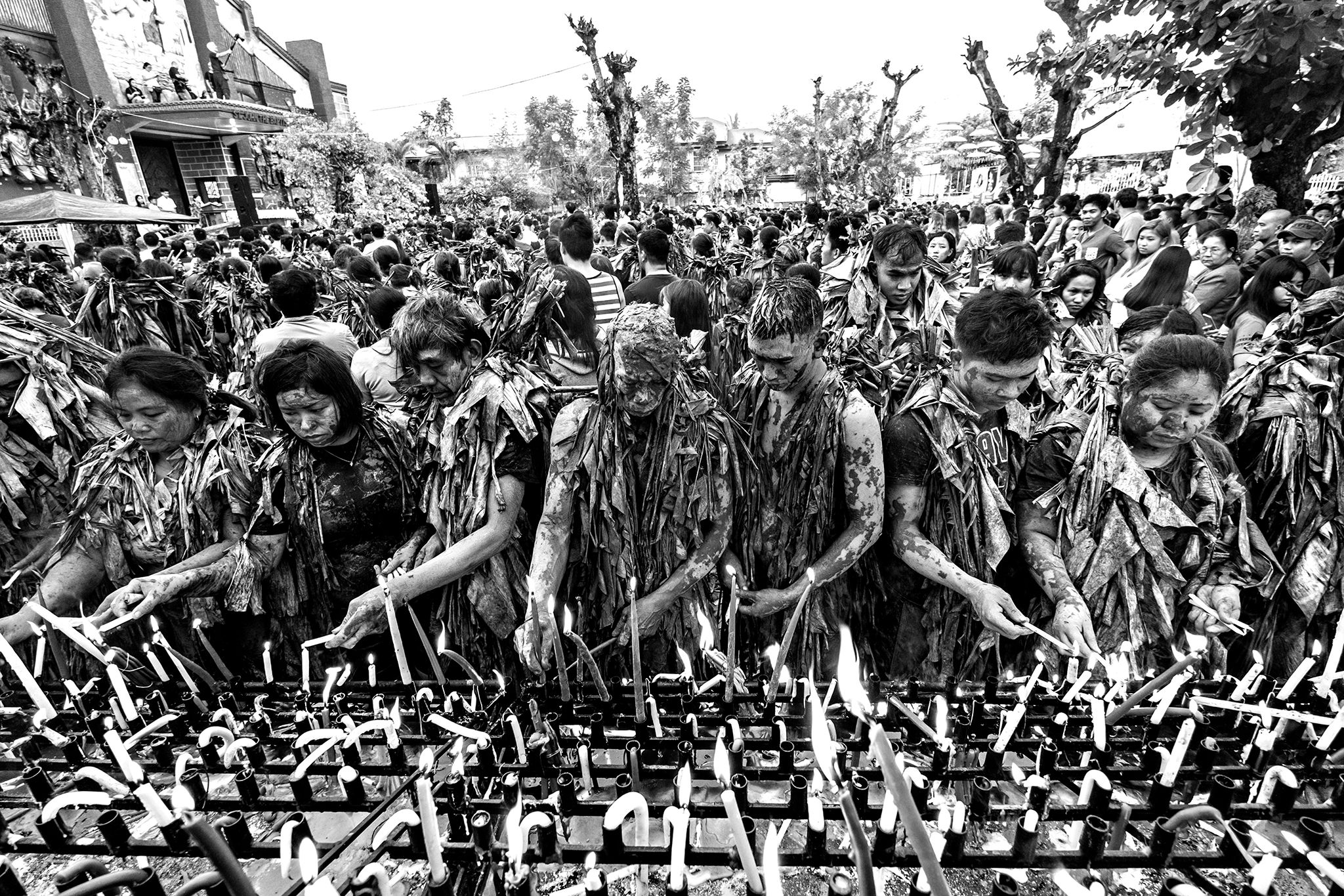 Mud People or “Taong Putik” in a local Filipino term, is a religious ritual in the town of Aliga, Nueva Ecija in the Philippines in honor of their patron saint. Smeared with mud all over their body and faces and covered with banana leaves, this devotees hid their identity emulating their patron and goes to the church for a thanksgiving mass followed by lighting of candles.